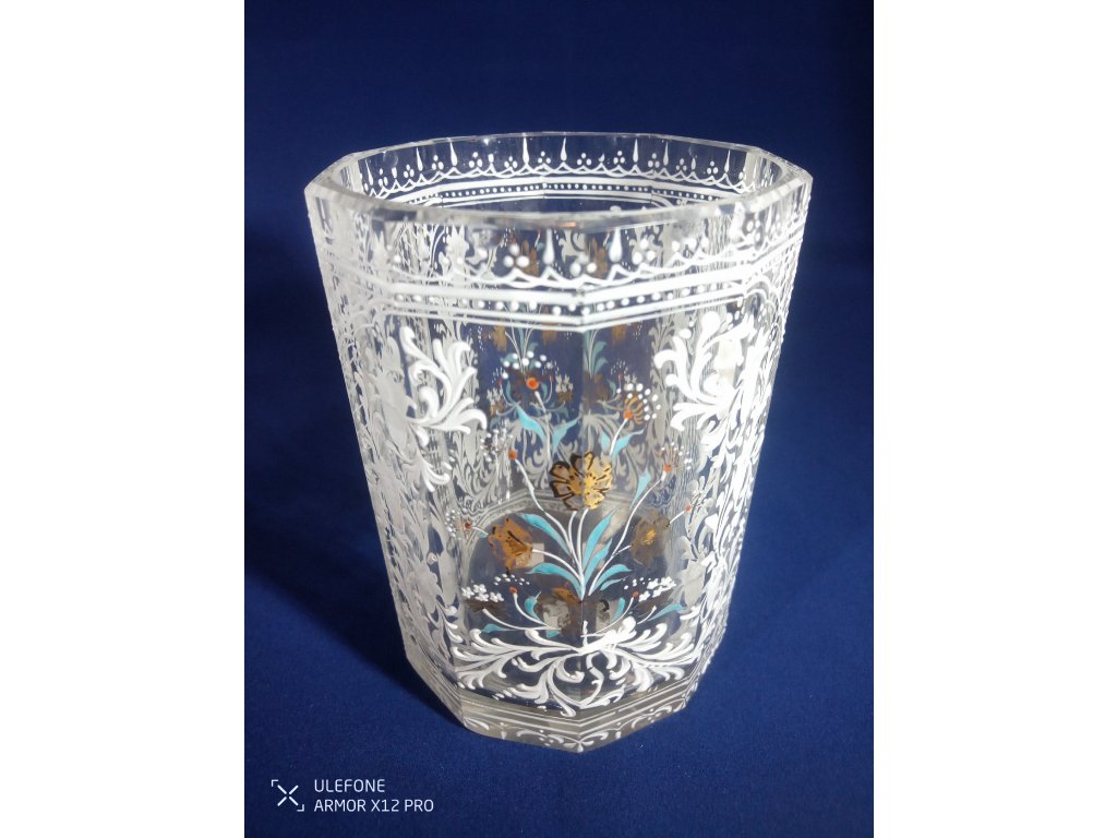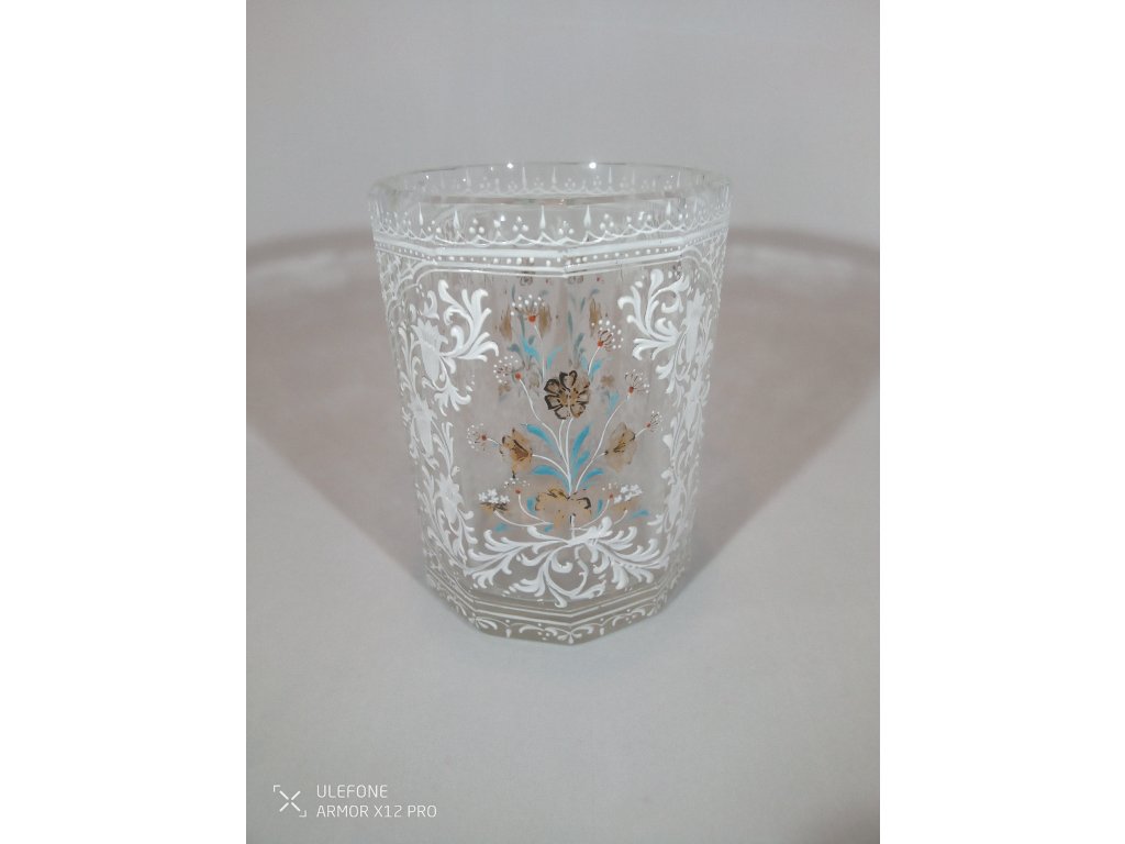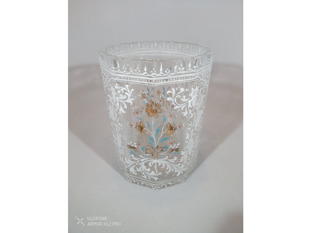 Sklenice je bez poškození, pouze jemně odřený spodek sklenice. Vznik cca. druhá polovina 19. století. Výška 10cm, šířka v hrdle 7,3cm, váha 277g. Doprava zdarma.