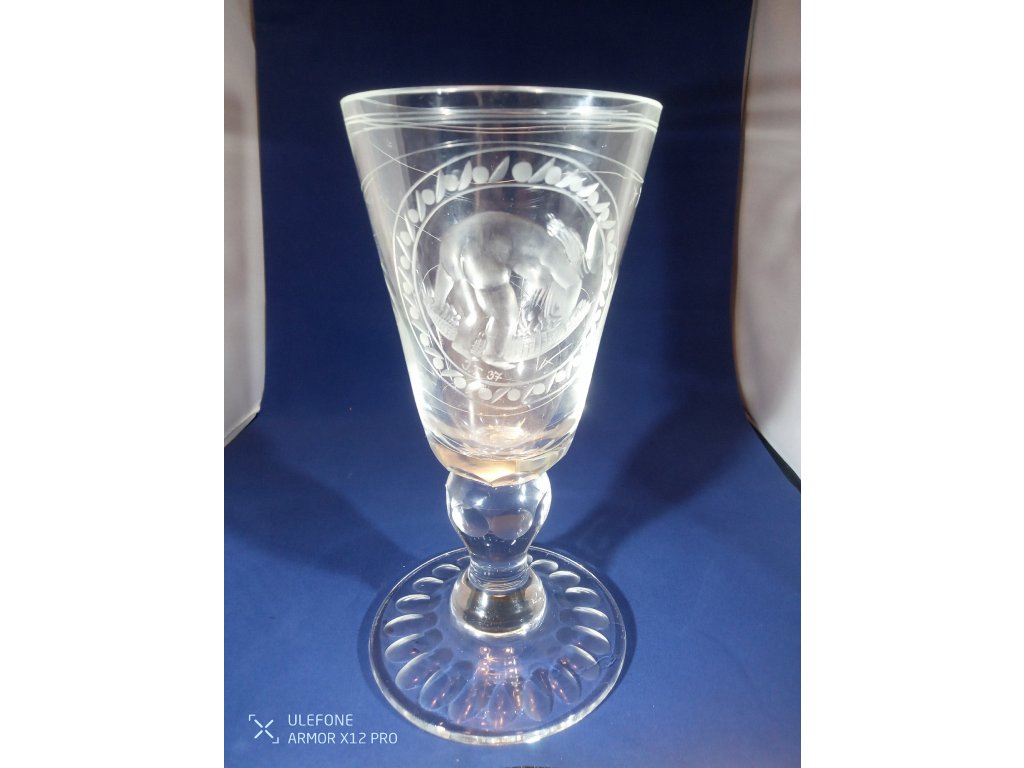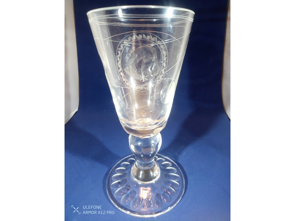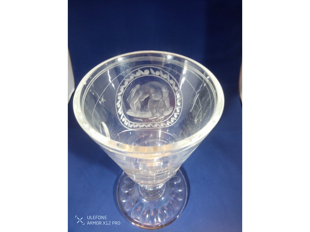 Masivní rytý pohár je bez poškození, signovaný J.T. 37. Výška 22cm, šířka v hrdle 10cm, váha 754g.