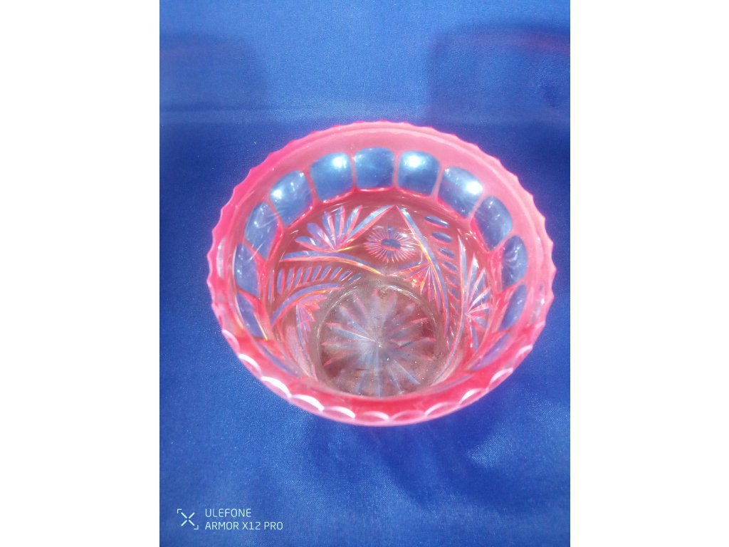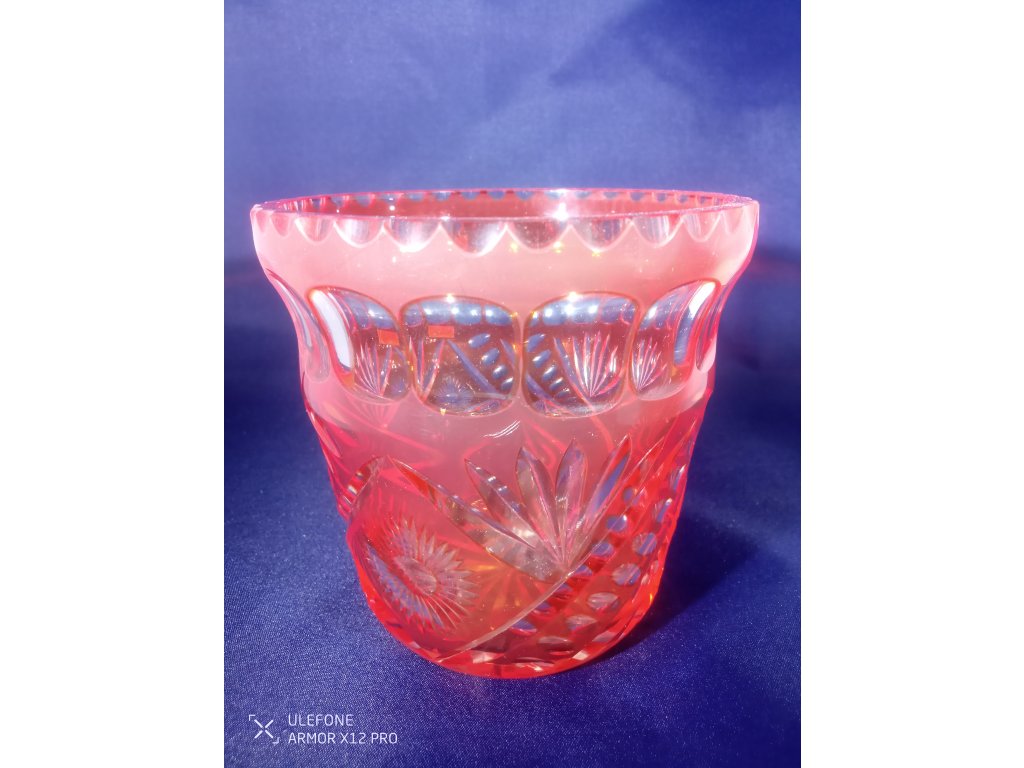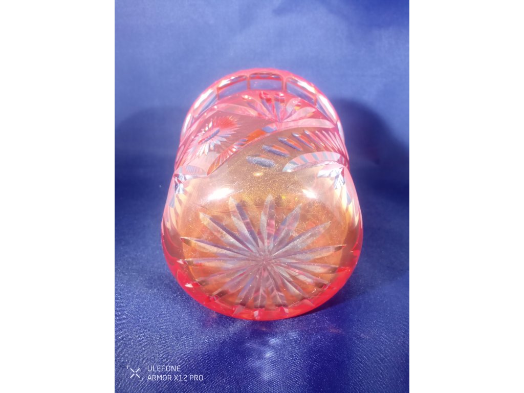 Váza je bez poškození. Jedná se o vázu s přejímaného skla. Doba vzniku 30. až 60. léta 20. století. Výška 11,5cm, šířka v hrdle 11,5cm, váha 545g.