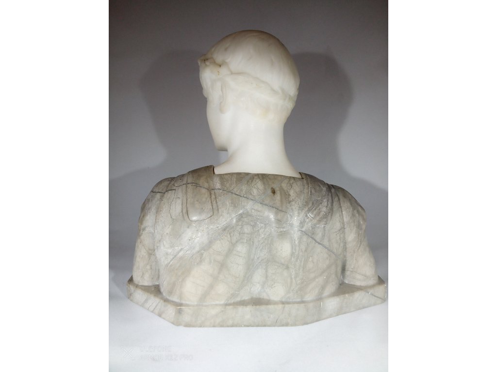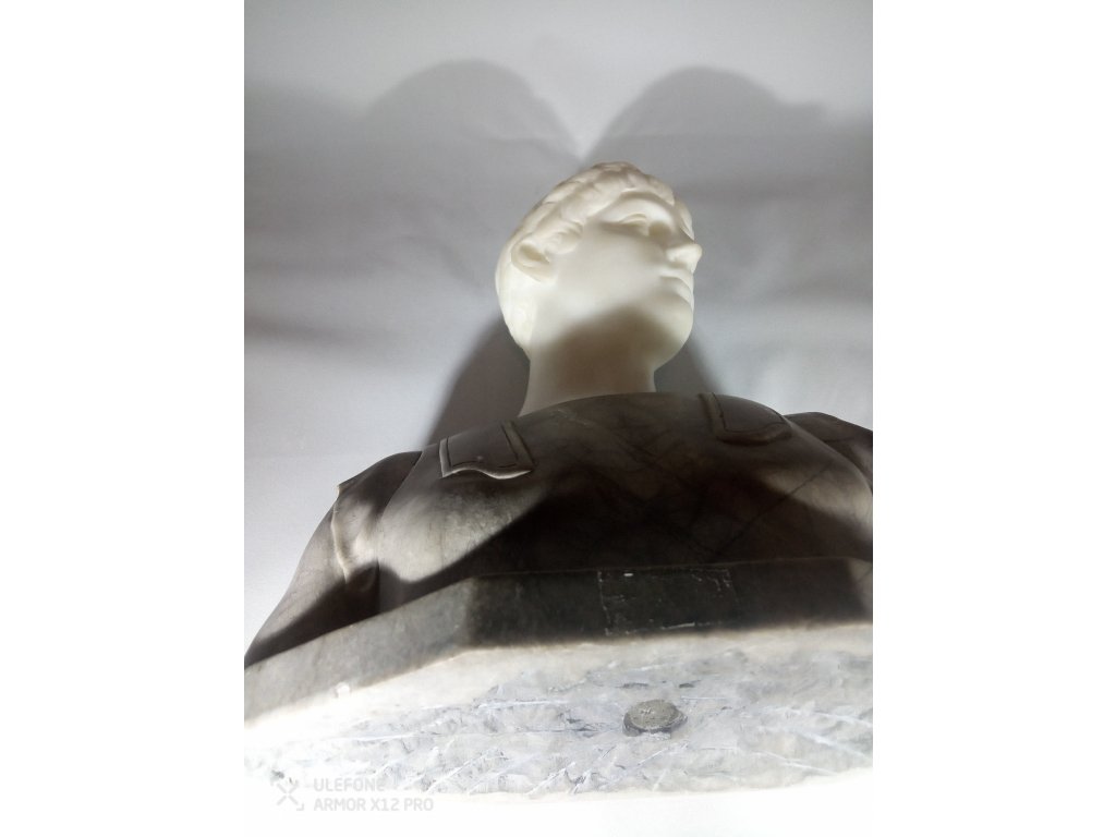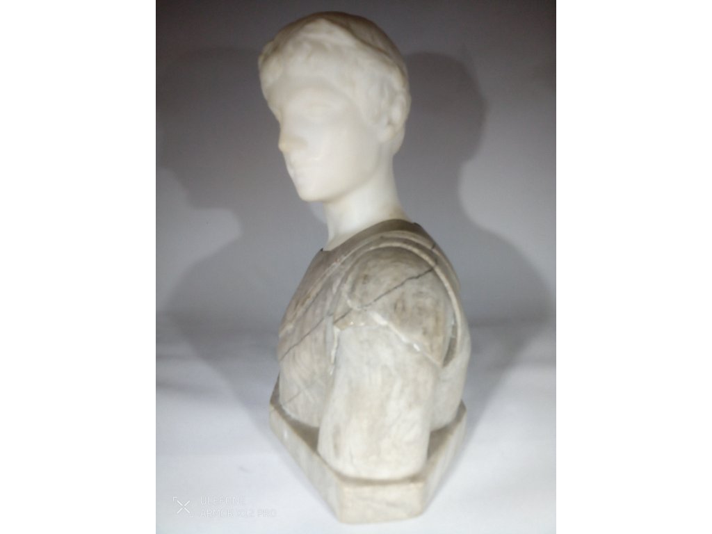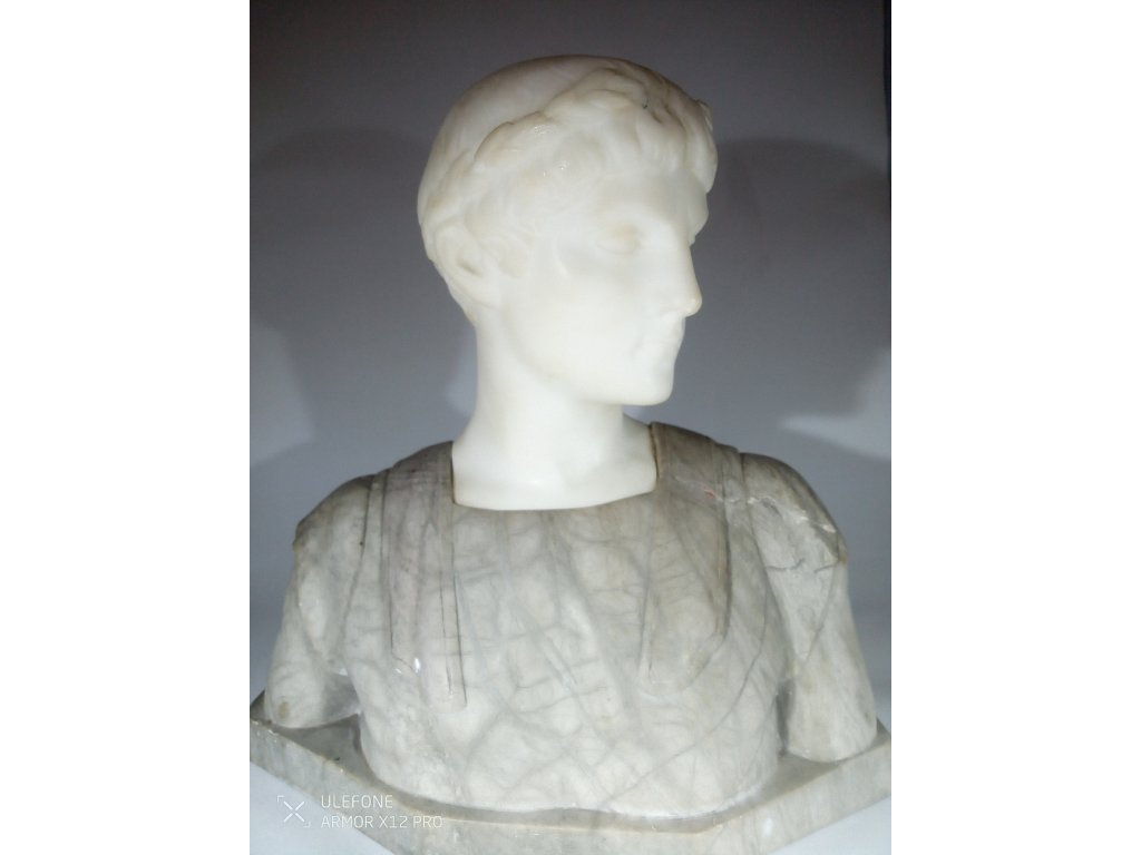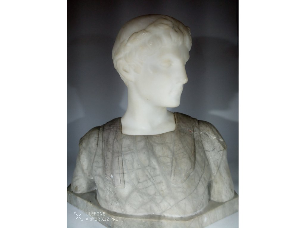 Jedná se o starožitnou mramorovou bustu Cesara pravděpodobně z 19. století. Signováno na zadní straně, špatně čitelné signace. Předmět je bez poškození, pouze malé přírodní prasklinky.,Výška 22cm, šířka 21cm, váha 3.766g